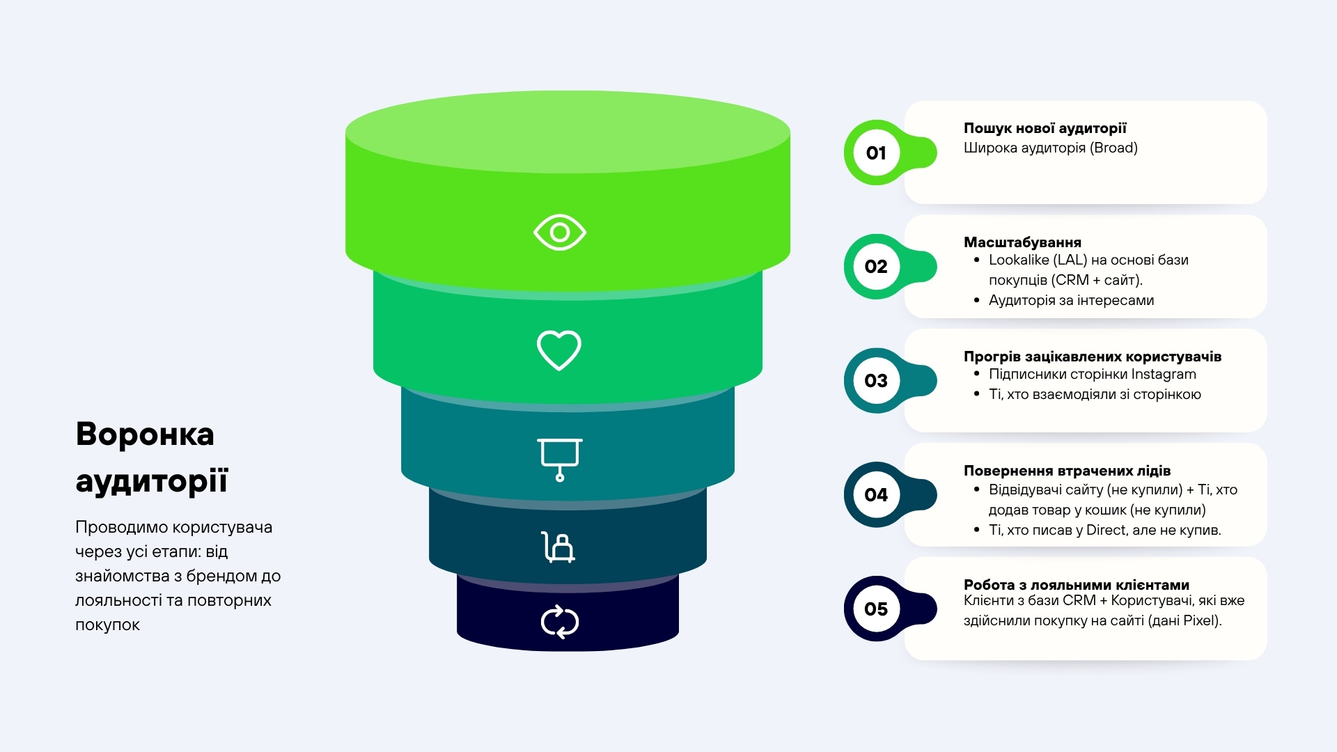 - Stufe 1: Skalierung und Suche nach neuer Zielgruppe (Acquisition). Hier arbeiten wir mit einer breiten Zielgruppe (Broad) und Lookalike (LAL) basierend auf der Kundendatenbank (CRM + Website). Unser Ziel ist es, neuen kalten Traffic zu gewinnen.